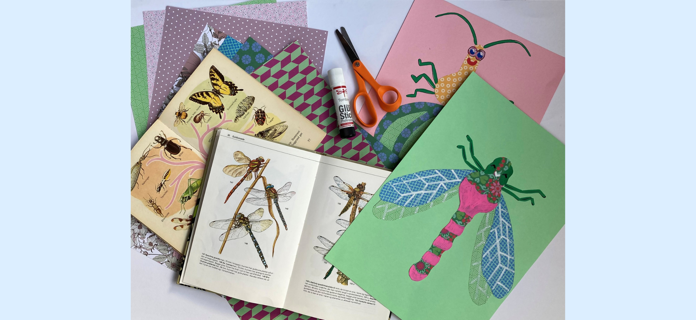 Denne formiddag kan børn og deres voksne skabe farverige collager inspireret af bier, guldsmede, sommerfugle, myrer og andre insekter, der lever side om side med os i byen. Vi arbejder med forskellige materialer, former og farver, og der vil være masser af skabeloner og materialer, som kan sætte fantasien i gang.
