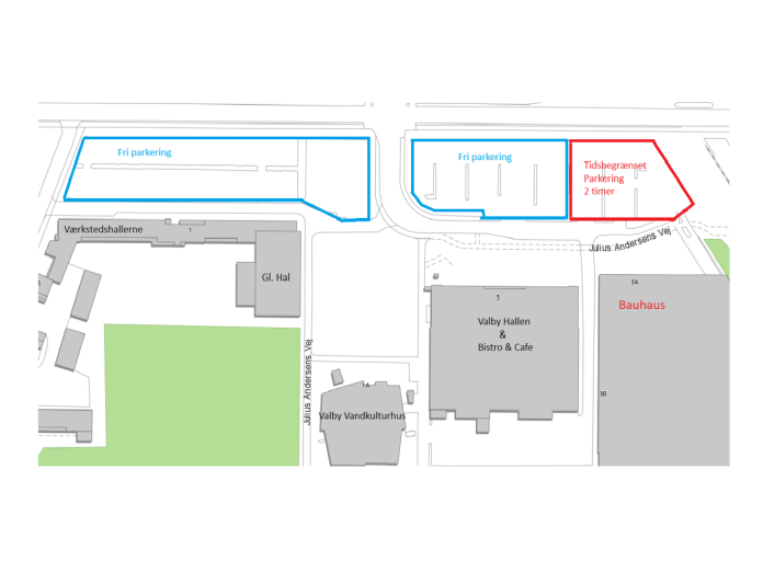 Bauhaus' parkeringspladser er det røde område, og der er to timers parkering med korrekt indstillet p-skive. Vær opmærksom på skiltningen på parkeringspladsen.