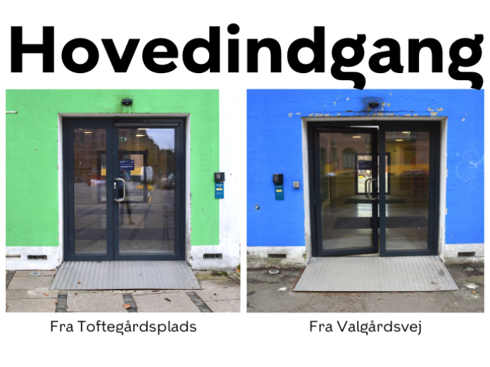 Hoveddørene til Valby Kulturhus er 90 cm. bredde og åbner automatisk i hele Kulturhusets normale åbningstid.