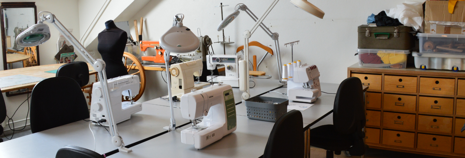 Du kan male eller tegne atelieret eller være kreativ i vores syværksted med overlocker, almindelige symaskiner og tuftingmaskine eller i vores MINI FabLab med 3D printer, lasercutter og tekstilprinter, Måske linoleumstryk er noget for dig? Så bruge vores trykkeri - vi har det hele. Eller hvad med læderværkstedet?