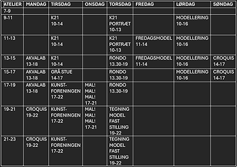 Vær dog opmærksom på, at mange kunstnergrupper allerede har aftalt at mødes på bestemte tidspunkter. Skemaet for atelierets forskellige hold kan ses til venstre for døren ind til atelieret eller længere nede her på siden under Atelieroversigt.