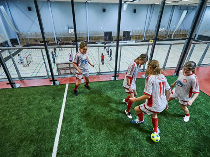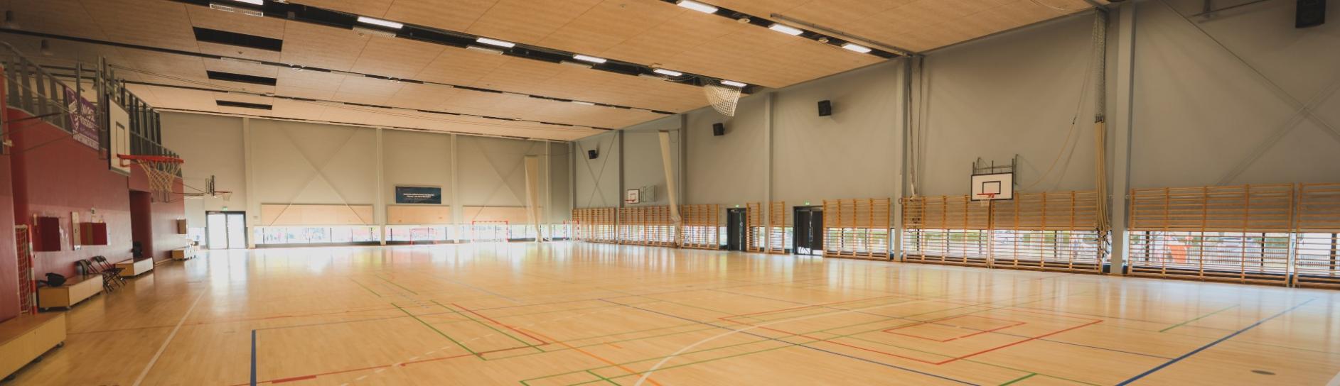 Der er to haller, hvor man kan spille badminton, floorball, håndbold m/u harpiks, volleyball, futsal og minitennis.